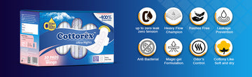 Half As Thin As A Regular Napkin With Up To 100% Fluid Lock* For comfort throughout the day, Cottorex Ultra Nights XXL is the ultra pad for you.