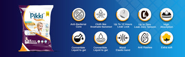 Key Features Quick Max Absorption technology to provide quick absorption and lonf lasting dryness. The Diaper pants that provide Super Comfort, Super Dryness and Super Protection to the baby. Zig-Zag Channels Middle Layer - It provides a large absorbing area and facilitates uniform liquid distribution and thereby, uniform absorption. Active Gel Bottom Layer - It contains gel crystals of hydrophilic polymer which helps in maximun absorption. 3D leak guard - Soft expandable elastic on the sides help prevent side leakage by locking the liquid into the side pockets from where it again gets absorbed. All the above features ensure dryness that lasts up to 12 hours which means a peaceful night's sleep for both mother and baby. Ideal for babies weighing 7-12 KG Other Features U-shaped ergonomic design ensures a snug fit and maximizes. It helps prevent heaviness and sagging. Skin friendly breathable materials which are gentle on the baby's delicate skin and protect against rashes. Superior soft materials and wide elastic bands which ensure maximum comfort for the baby.