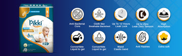 Key Features Quick Max Absorption technology to provide quick absorption and lonf lasting dryness. The Diaper pants that provide Super Comfort, Super Dryness and Super Protection to the baby. Zig-Zag Channels Middle Layer - It provides a large absorbing area and facilitates uniform liquid distribution and thereby, uniform absorption. Active Gel Bottom Layer - It contains gel crystals of hydrophilic polymer which helps in maximun absorption. 3D leak guard - Soft expandable elastic on the sides help prevent side leakage by locking the liquid into the side pockets from where it again gets absorbed. All the above features ensure dryness that lasts up to 12 hours which means a peaceful night's sleep for both mother and baby. Ideal for babies weighing 4-8 KG Other Features U-shaped ergonomic design ensures a snug fit and maximizes. It helps prevent heaviness and sagging. Skin friendly breathable materials which are gentle on the baby's delicate skin and protect against rashes. Superior soft materials and wide elastic bands which ensure maximum comfort for the baby.